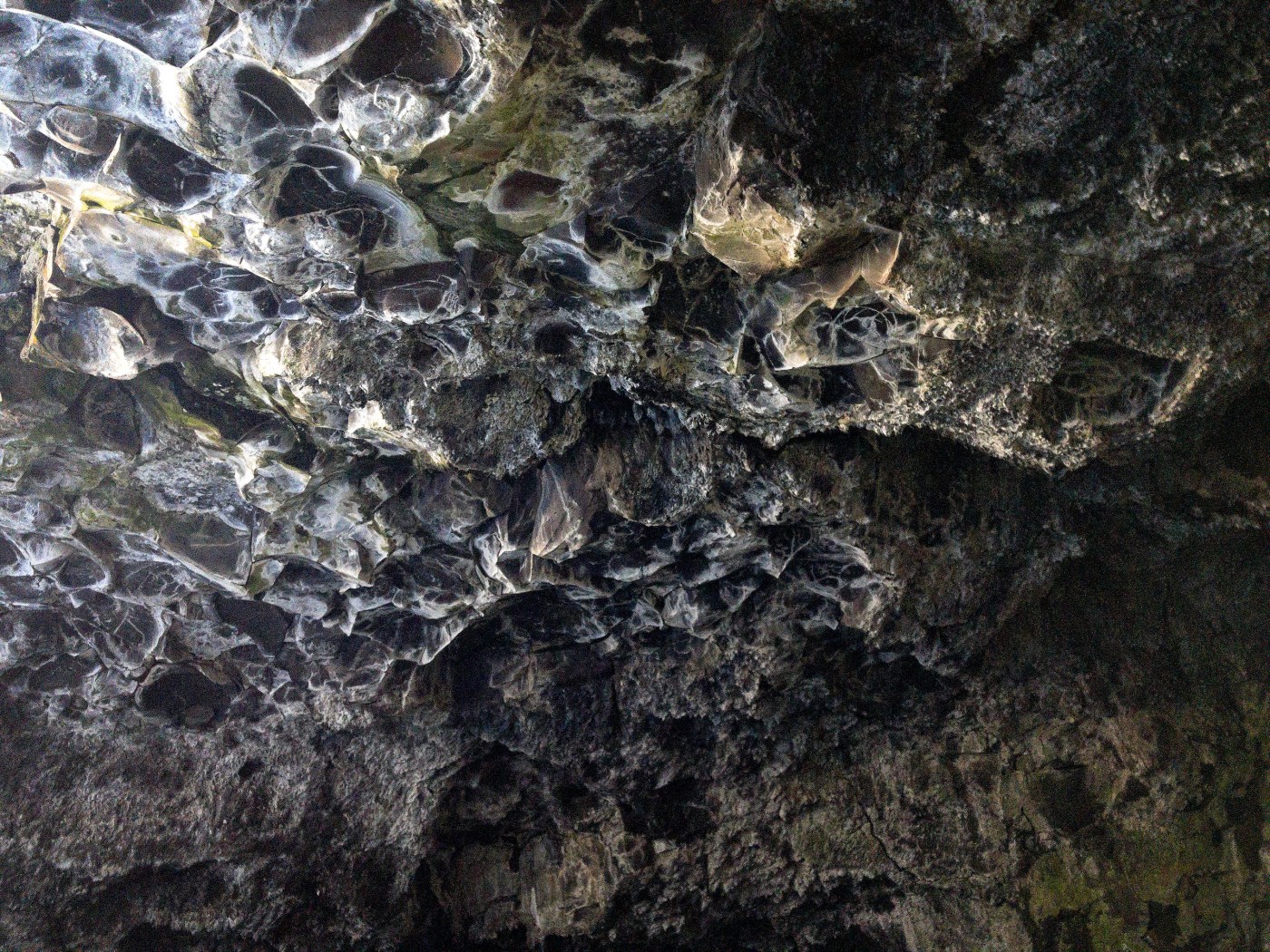 Yesterday I wrote about how The Alien Rock had fallen from the ceiling above during a collapse of the lava tube. This is the ceiling it fell from. The amount of texture in it is hard to comprehend without focusing on small areas one at a time. There is the brighter, mirror-like rock near the hole in the cave ceiling; the gritty, rough rock on the cave walls and further away from the opening; the convex shapes created when the rock breaks free from where it was deposited when the lava tube was active. During our time at Craters of the Moon National Monument, the textures were amazing and unlike anything I had seen in person. I hope this picture gives a sense of that vision.